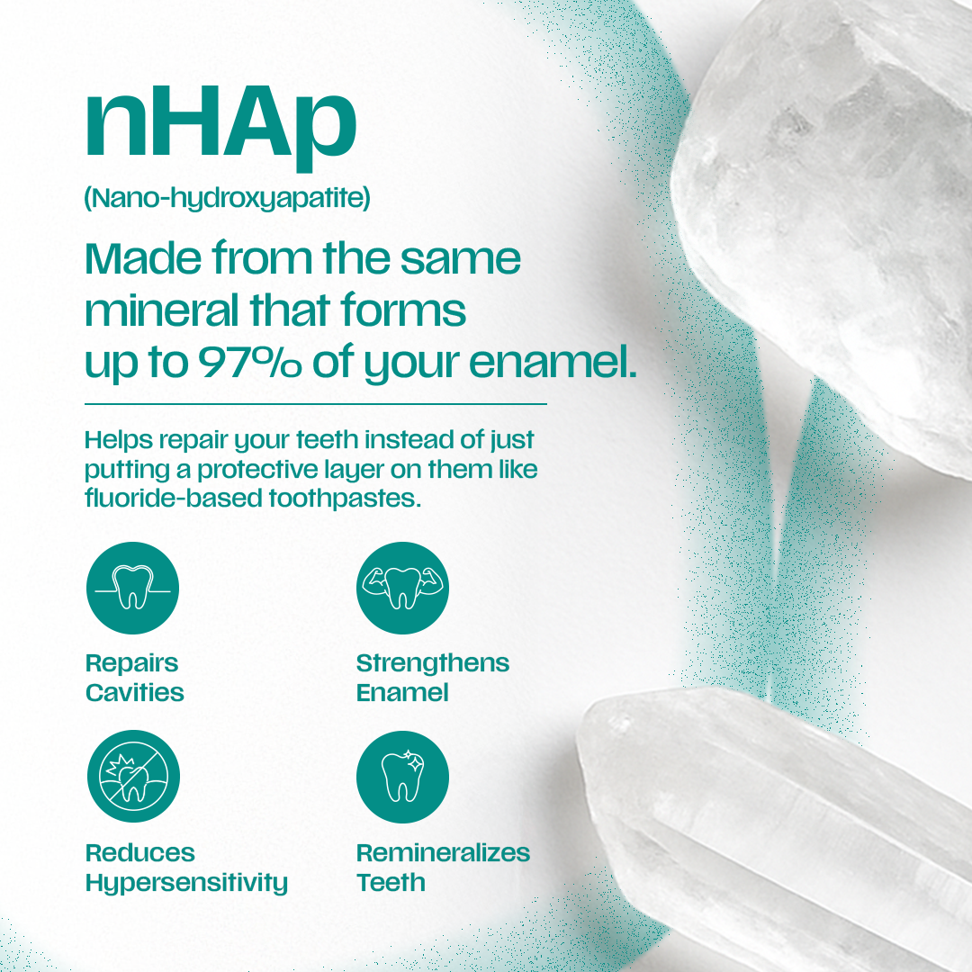 Powered by Nano Hydroxyapatite (nHAp), this toothpaste mimics the natural structure of Enamel to promote enamel remineralization and repair. It functions as a trusted enamel repair toothpaste, helping repair enamel worn down by acid erosion, over-brushing, or gum recession.