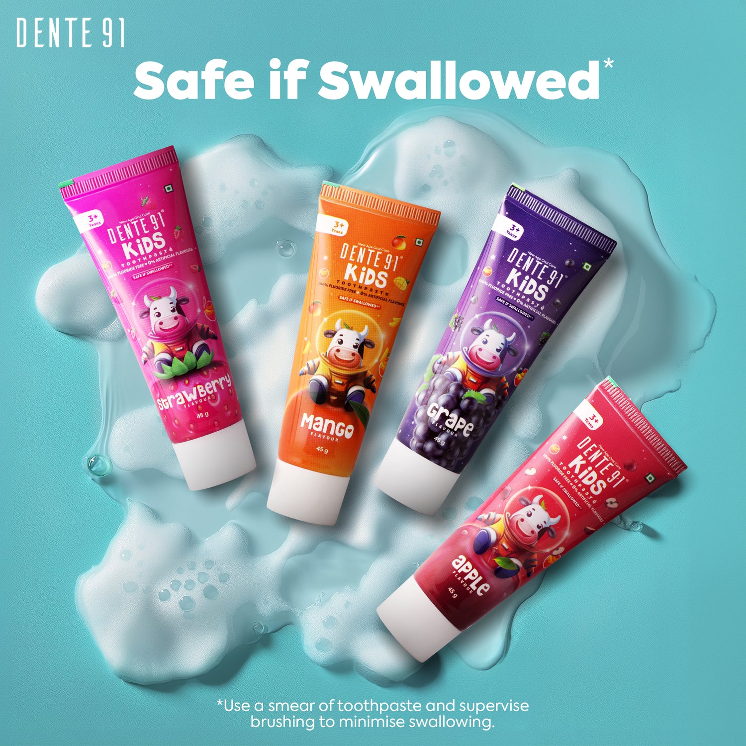 Fun Fruity Brushing: Dente91 Kids Toothpaste makes brushing fun while motivating them to stick to a regular oral hygiene routine. Available in 4 fruity flavors; Apple, Mango, Strawberry and Grape.
