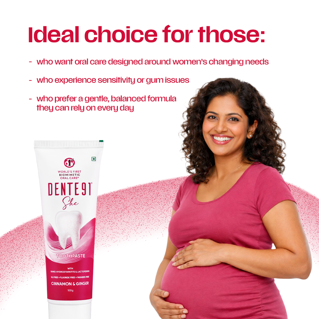 Dente91 SHE is a specialized toothpaste created to support women’s oral health across life stages, where hormonal changes can increase the risk of cavities, gum issues, and bad breath.