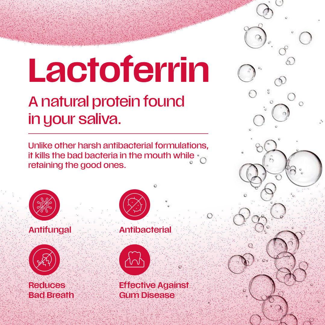 With lactoferrin, it helps control plaque-causing bacteria, supports gum health, and aids bad breath removal.