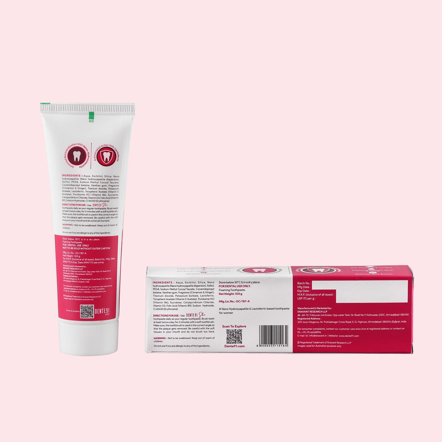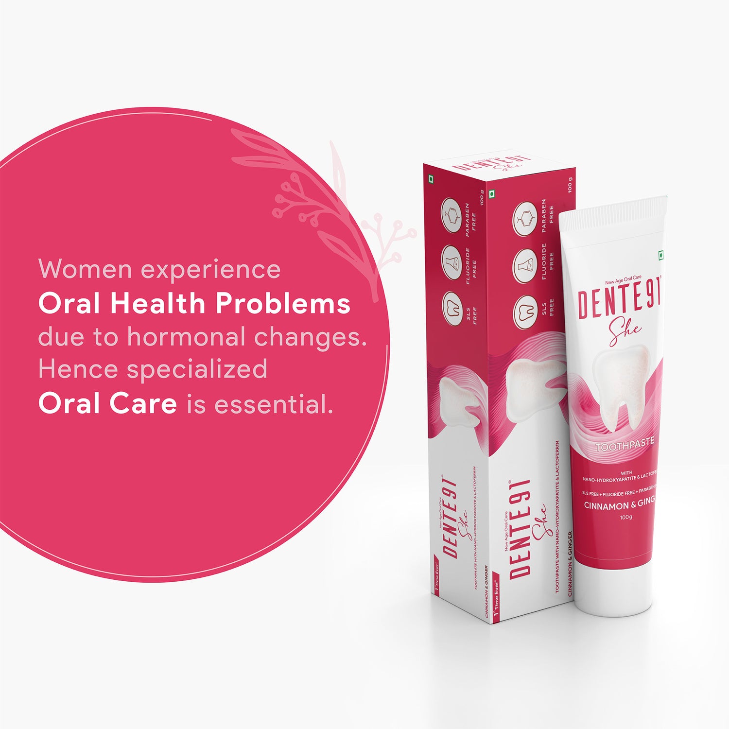- Dente91 SHE Toothpaste is the first-of-its-kind toothpaste in India specially created to protect as well as augment women’s oral health. It contains Folic acid (Vitamin B9), Vitamin B6, Vitamin E and Vitamin D3 which helps to support women’s oral health across her lifespan.