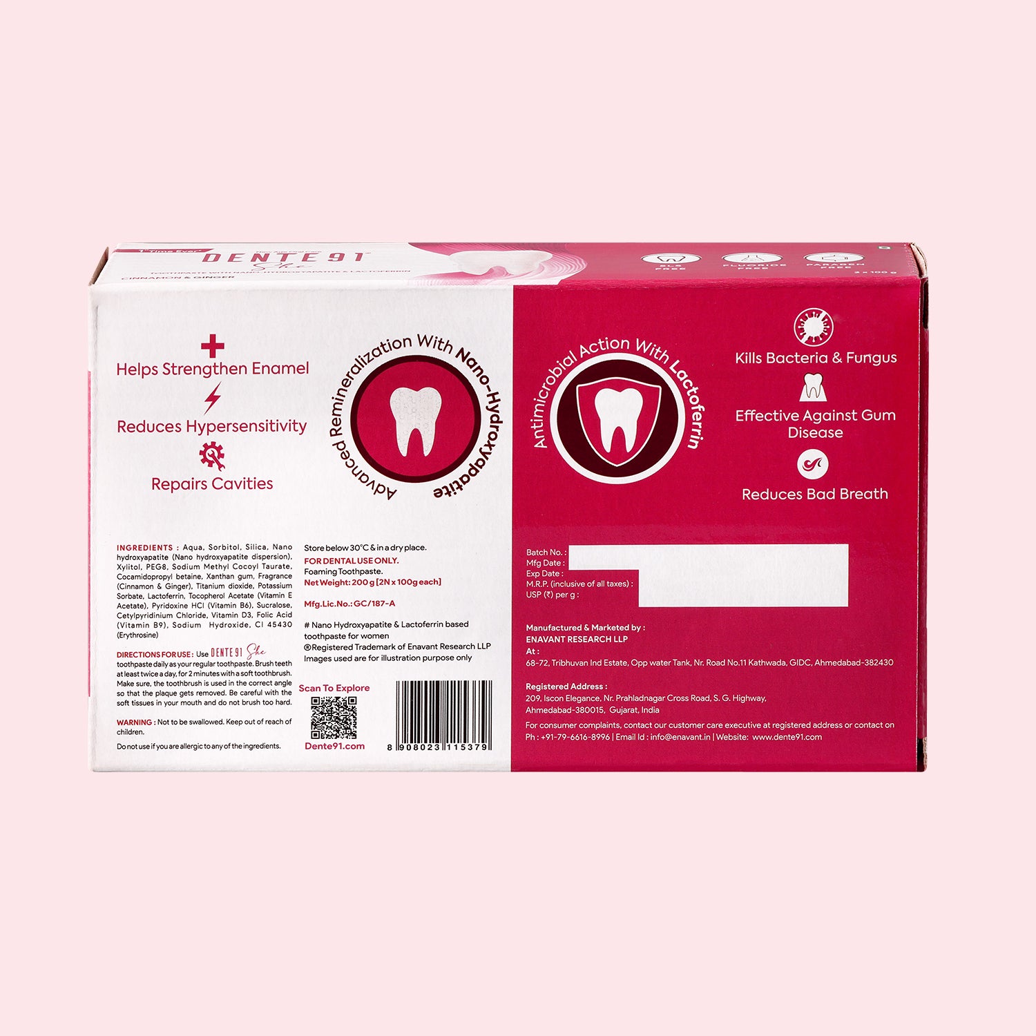 - Natural remineralization of teeth via unique ingredient Nano Hydroxyapatite & unlike fluoride based traditional toothpaste. Nano Hydroxyapatite in Dente91 SHE Toothpaste helps to strengthen teeth enamel, reduce hypersensitivity and plaque and repair cavities.